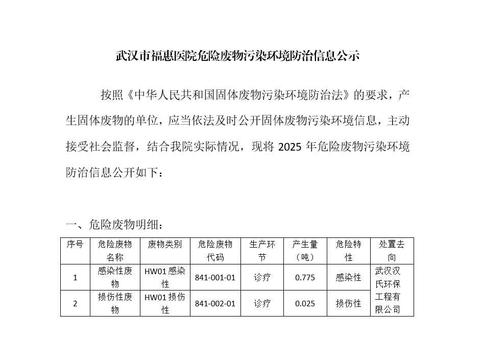 武汉市福惠医院危险废物污染环境防治信息公示
