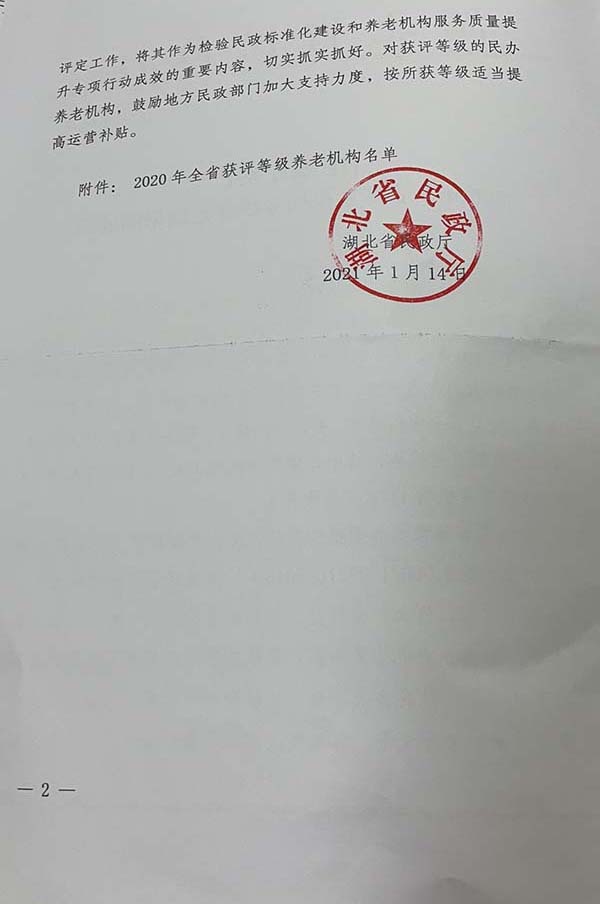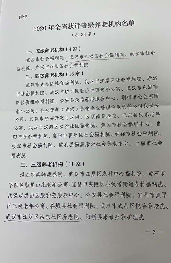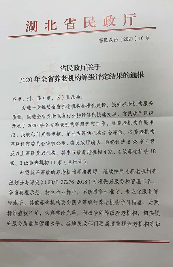 为进一步推动全省养老机构标准化建设,提升养老机构服务质量,促进全省养老服务行业持续健康快速发展,省民政厅组织开展了2020年全省养老机构等级评定工作。经养老机构自愿申报、民政部门资格审核、第三方评估机构综合评估、省养老机构等级评定委员会审核公示、省民政厅确认,最终评选出33家三级及以上等级养老机构,其中5级养老机构4家、4级养老机构18家、3级养老机构11家(见附件)。